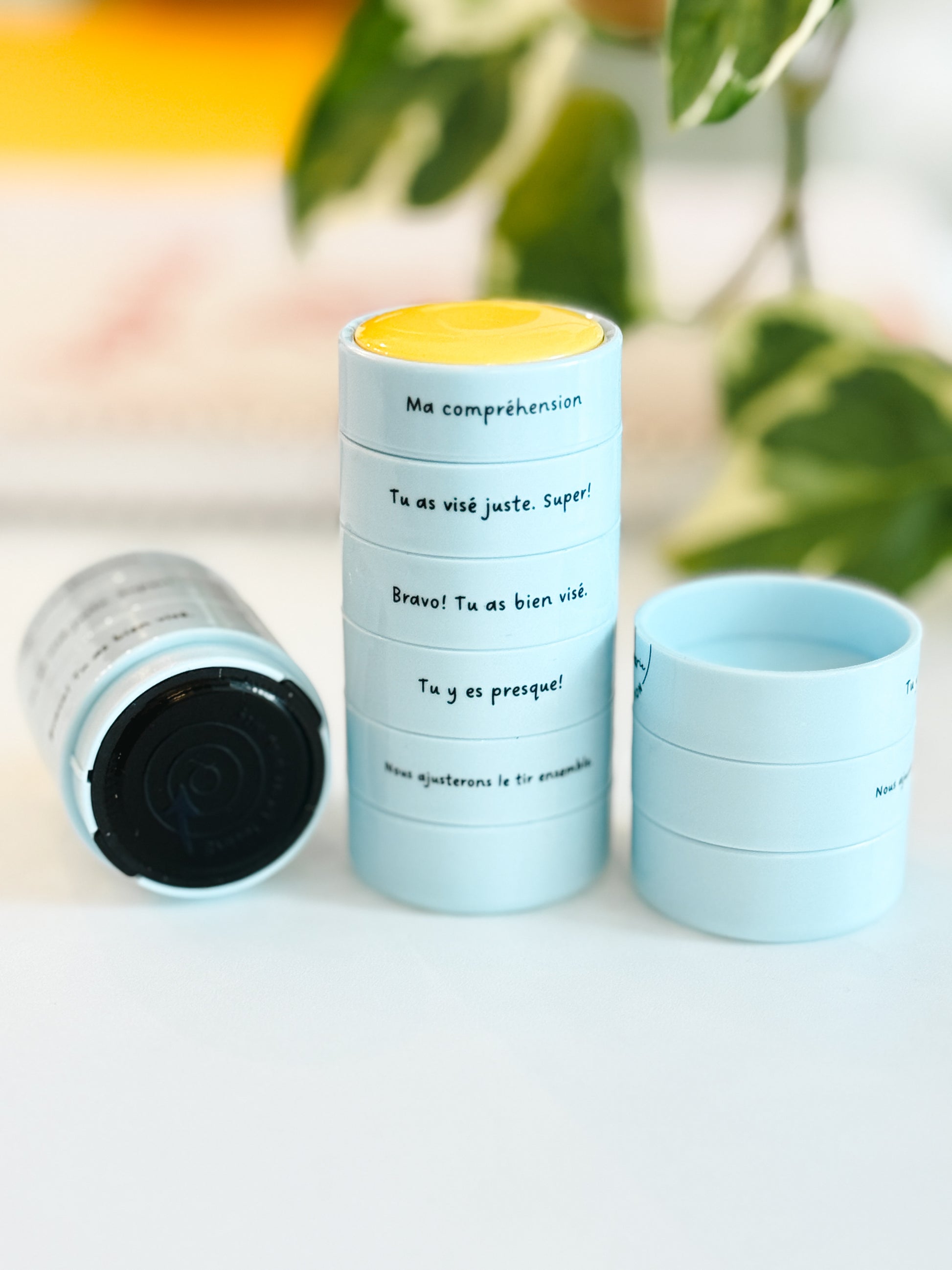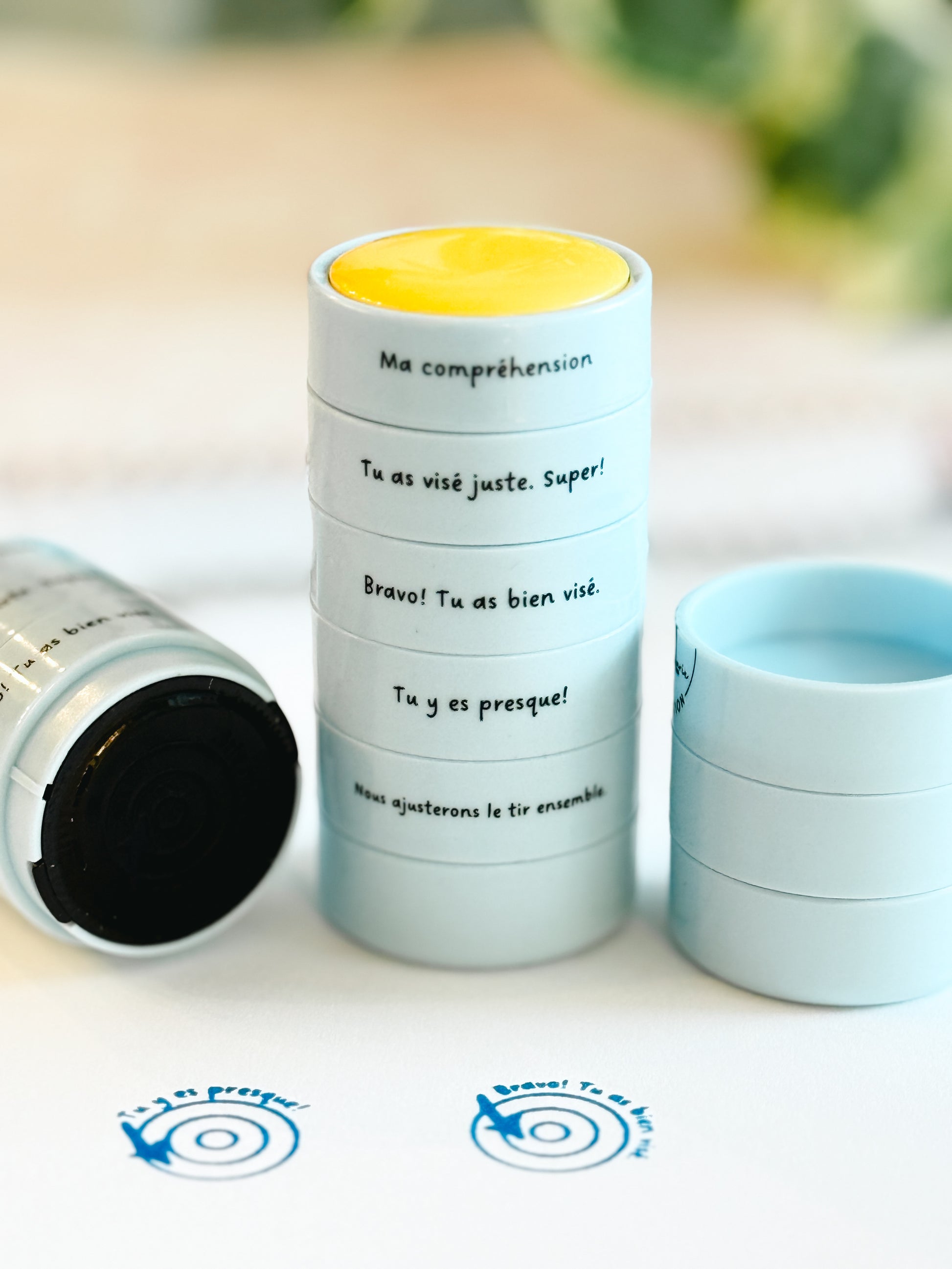 Chaque message aide les élèves à comprendre où ils en sont dans leurs apprentissages, tout en ajoutant une touche positive à leurs travaux. De plus, toutes les cibles sont de couleur bleue. De cette façon, les élèves ne peuvent se comparer en voyant la couleur de la cible de son voisin.
